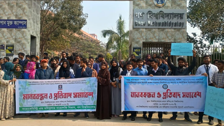 স্বাস্থ্য অধিদপ্তরের প্রকাশিত প্যাথলজিক্যাল ল্যাব রিপোর্ট স্বাক্ষর সংক্রান্ত নির্দেশনার প্রতিবাদে মানববন্ধন ও প্রতিবাদ সমাবেশ কর্মসূচি পালন করেছে সাভারের গণ বিশ্ববিদ্যালয়ের (গবি) বায়োকেমিস্ট্রি এন্ড মলিকুলার বায়োলজি বিভাগের শিক্ষার্থীরা।